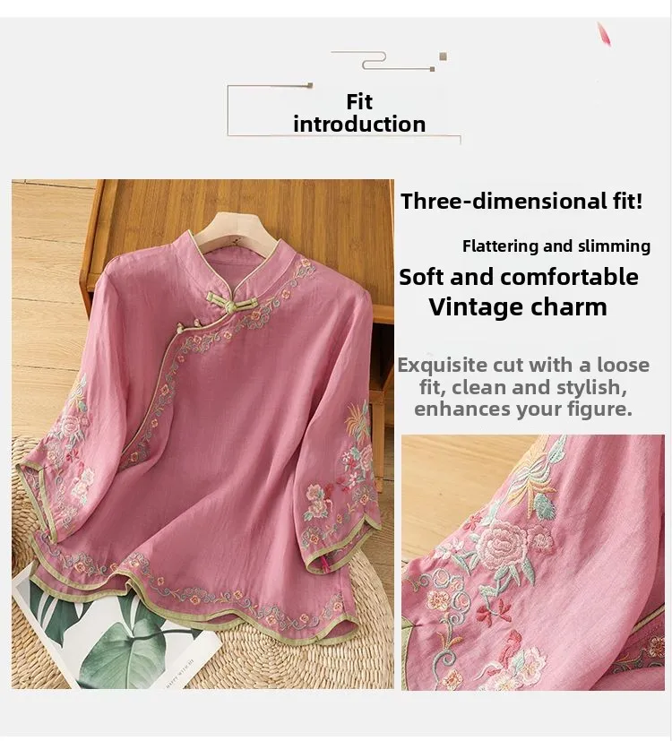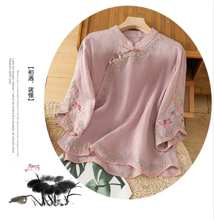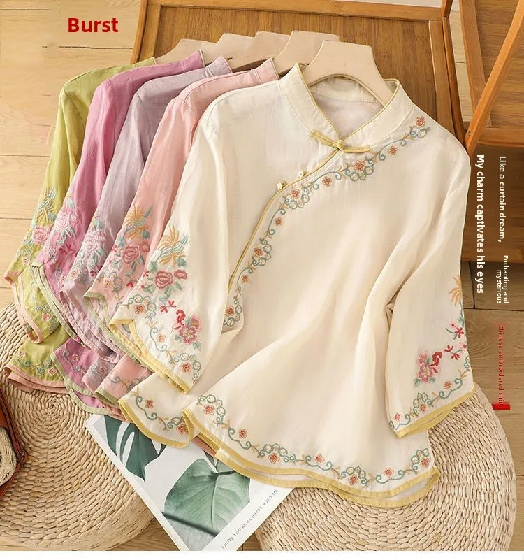 MIAOYUAN | Mandarin Collar Embroidered Cotton Linen Blouse for Women