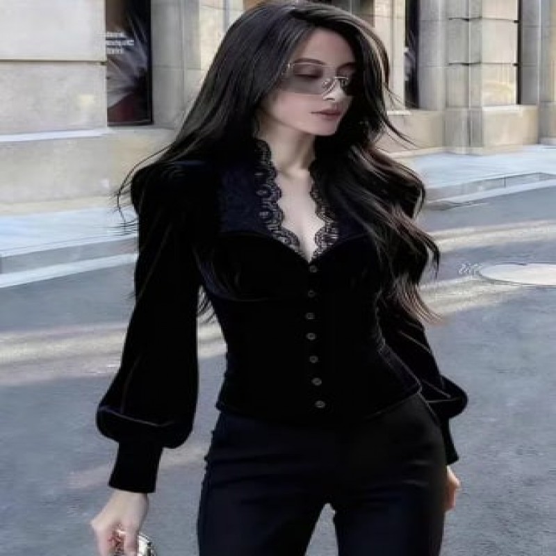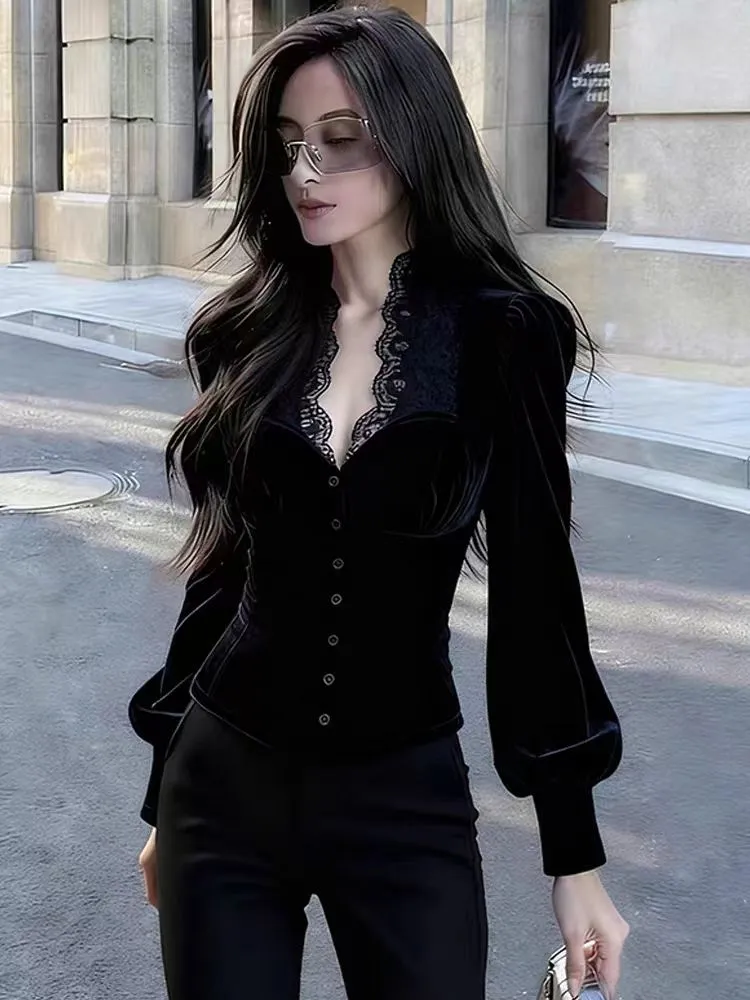 Black Velvet Shirt Women's Style Slim Fit Long Sleeve V-Neck Fashionable Age-Defying Elegant Waist-Cinching Top