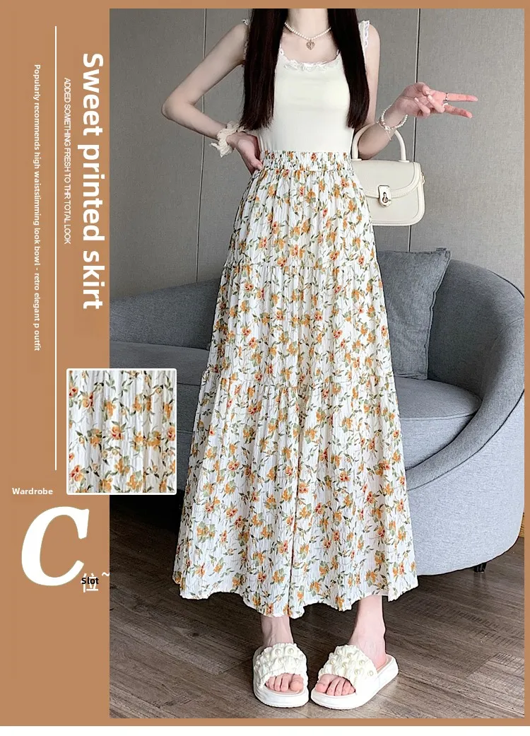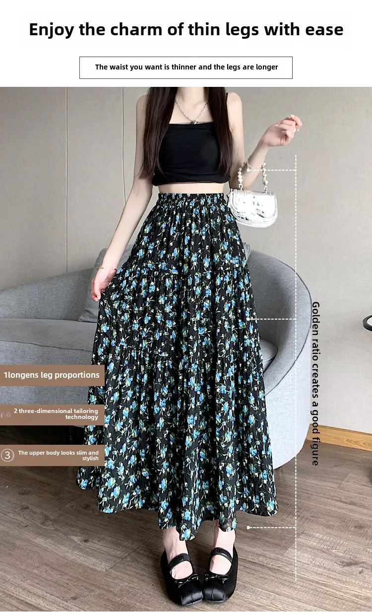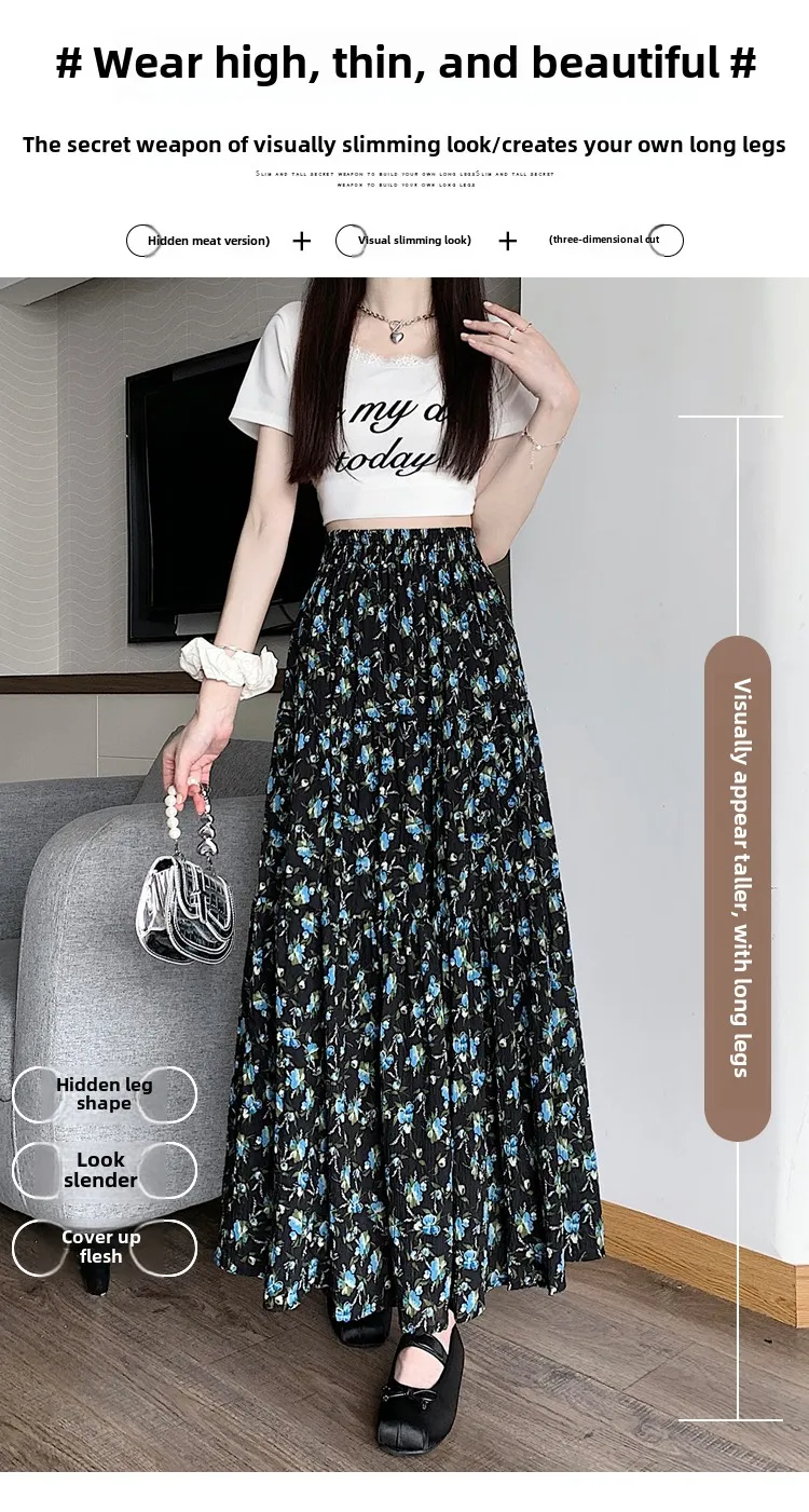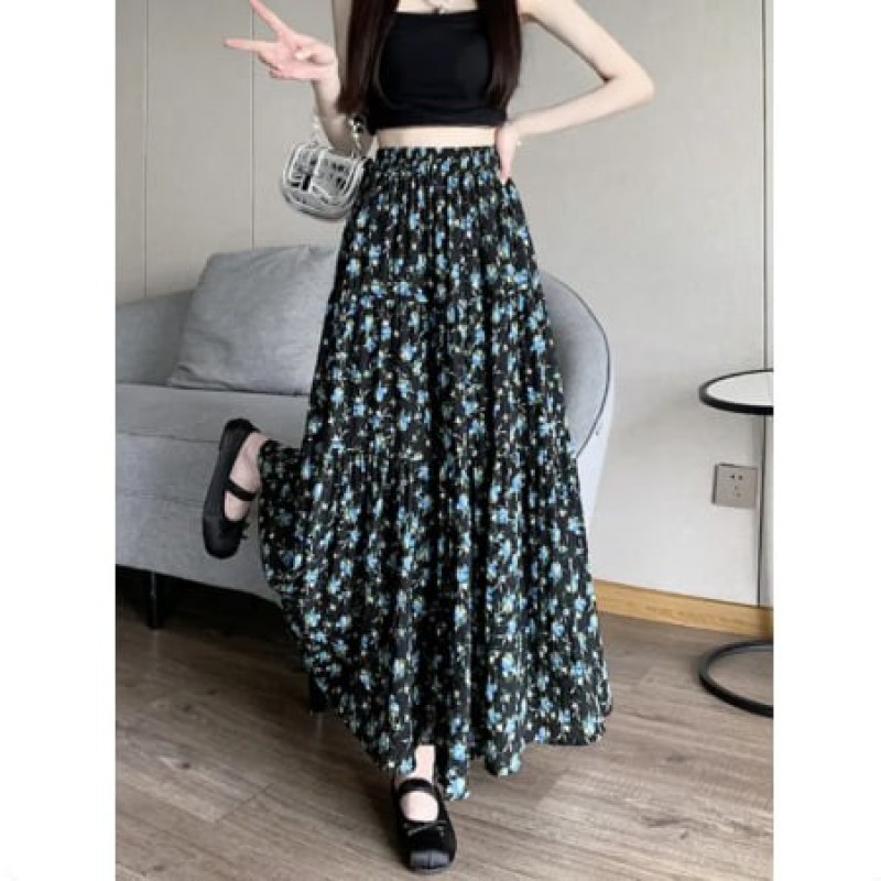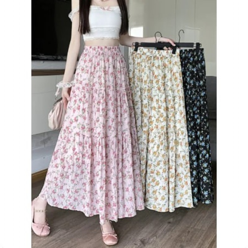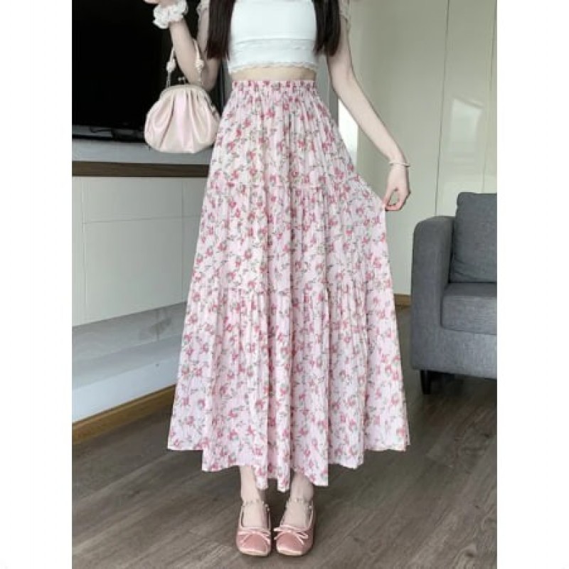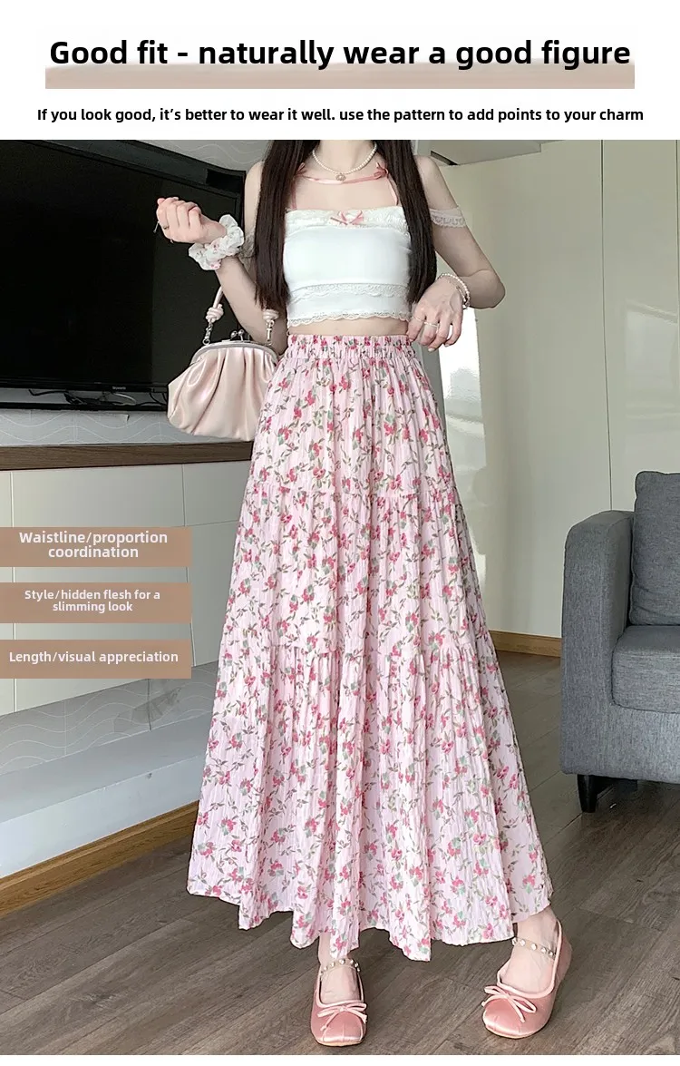 Fresh Country Floral Half Skirt Women's Summer New Style Korean Versatile Long Skirt with Lace Edge High Waist A-Line Dress