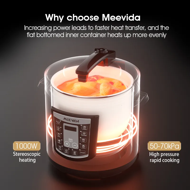 50-70kPa high-pressure speed cooking, increasing power leads to faster heat conduction, and the flat bottomed inner pot is heated more evenly;
