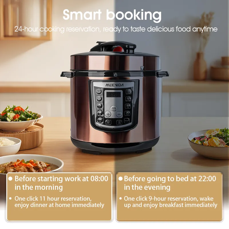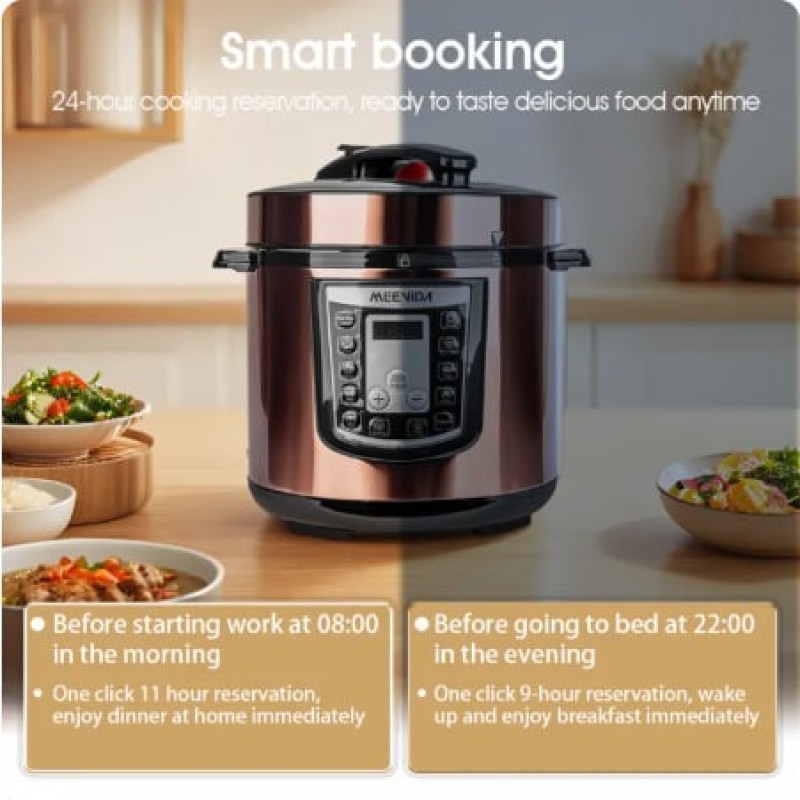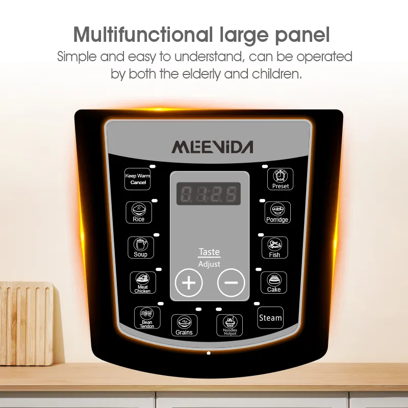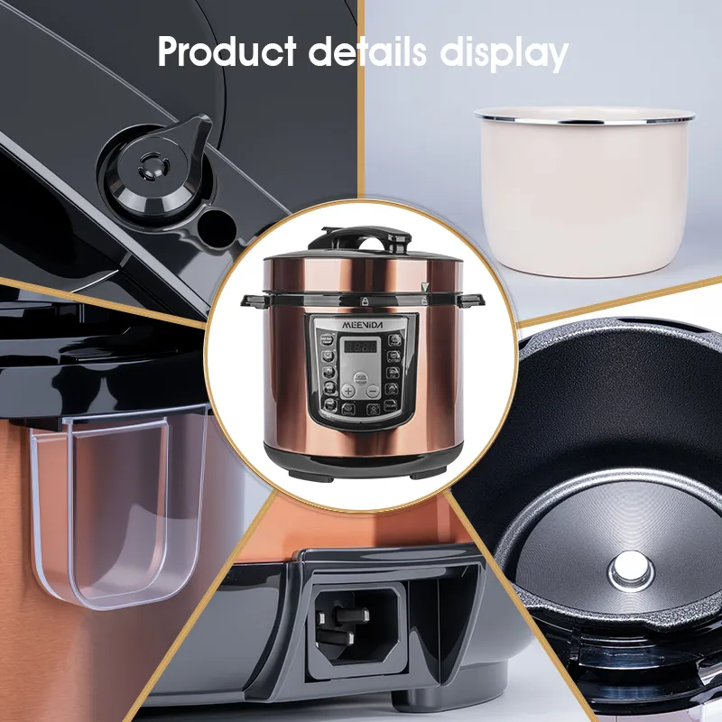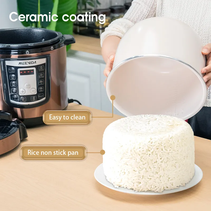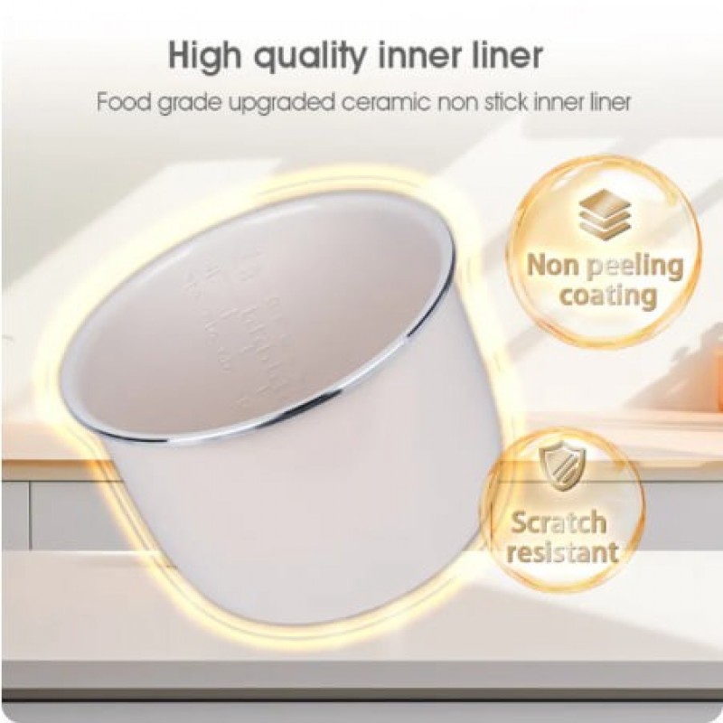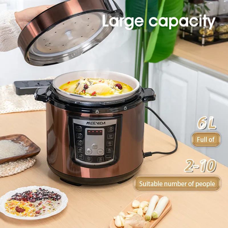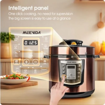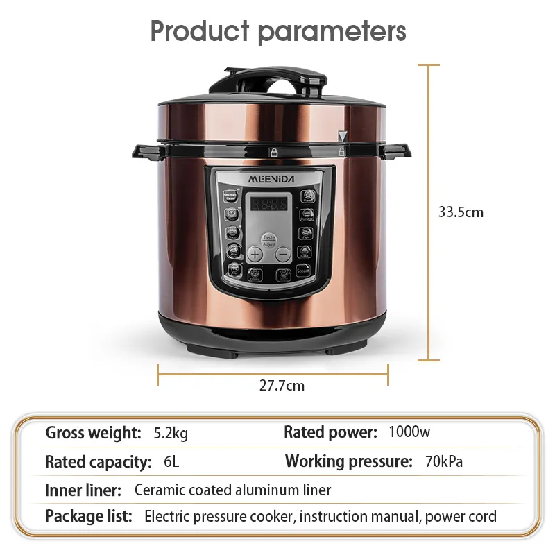 【 New Product Promotion 】 Quick Delivery, Enjoy First Welcome to "MEEVIDA Small Appliances Lazada Mall" ⚡Ready stock available for all items except "Preorder" items, sourced locally from Malaysia. ⚡We ship within 24 working hours! ⚡ Delivery to your doorstep within 1-3 days, depending on standard delivery. We support communication in 2 languages: English and Chinese. In case of any issues with the package or product received, please refrain from confirming receipt or leaving negative feedback. Instead, kindly contact us immediately to resolve the issue. Product Name: Smart Home Large Capacity Pressure Cooker, Electric Rice Cooker, Pressure Cooker, Voltage Cooker Material: Plastic+Metal Color (Specification): Gold 6L Product color box size: 31.5 × 31.5 × 37.5cm Gross weight: 5.2kg Power: 1000w Inner liner: Ceramic coated aluminum liner Package list: Electric pressure cooker * 1+instruction manual+power cord * 1 ① 6L large capacity; ② Food grade ceramic non stick inner liner; ③ 55-70kPa high pressure; ④ Top 10 functions; ⑤ 1000W high power; ⑥ Gift of rice spoon and measuring cup Notice: 1. Do not immerse the outer pot in water for rinsing during use to prevent internal moisture and electric shock. 2. Before each use, remember to check the exhaust valve and anti blocking cover of the electric pressure cooker. If there are any foreign objects, they should be cleaned immediately to avoid affecting normal exhaust. 3. The lid of the electric pressure cooker needs to be closed in place before cooking food. 4. Do not increase the weight on the pressure valve, increase the pressure inside the pot, or forcefully shorten the cooking time.