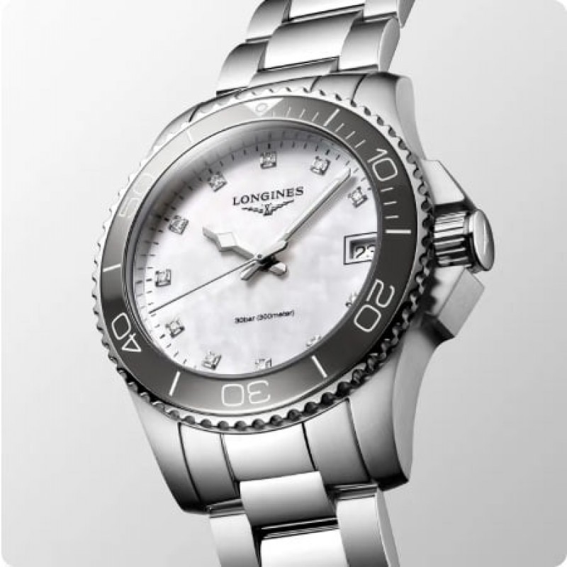 LONGINES HYDROCONQUEST 32MM MOTHER OF PEARL STAINLESS STEEL CERAMIC BEZEL QUARTZ WOMEN'S WATCH