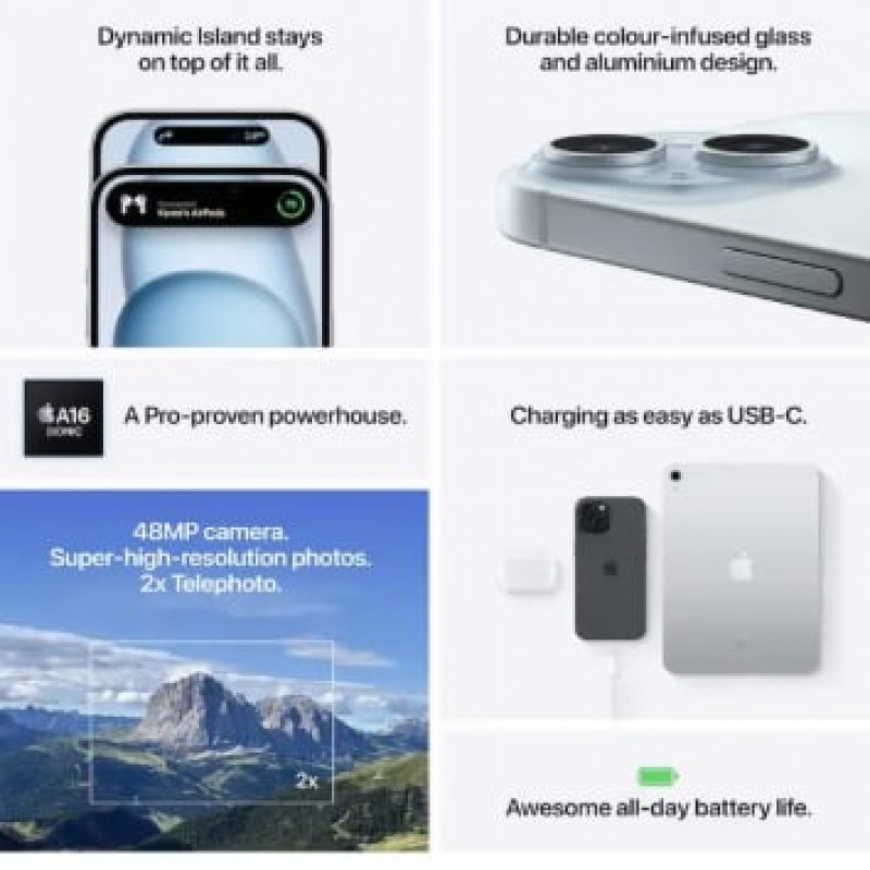 iPhone 15 brings you Dynamic Island, a 48MP Main camera and USB-C — all in a durable colour-infused glass and aluminium design. Key feature • DYNAMIC ISLAND COMES TO IPHONE 15 — Dynamic Island bubbles up alerts and Live Activities — so you don’t miss them while you’re doing something else. You can see who’s calling, check your flight status and so much more. • INNOVATIVE DESIGN — iPhone 15 features a durable colour-infused glass and aluminium design. It’s splash, water and dust resistant.1 The Ceramic Shield front is tougher than any smartphone glass. And the 6.1″ Super Retina XDR display2 is up to 2x brighter in the sun compared to iPhone 14. • 48MP MAIN CAMERA WITH 2X TELEPHOTO — The 48MP Main camera shoots in super-high resolution. So it’s easier than ever to take standout photos with amazing detail. The 2x optical-quality Telephoto lets you frame the perfect close-up. • NEXT-GENERATION PORTRAITS — Capture portraits with dramatically more detail and colour. Just tap to shift the focus between subjects — even after you take the shot. • POWERHOUSE A16 BIONIC CHIP — The super-fast chip powers advanced features like computational photography, fluid Dynamic Island transitions and Voice Isolation for phone calls. And A16 Bionic is incredibly efficient to help deliver great all-day battery life.3 • USB-C CONNECTIVITY — The USB‑C connector lets you charge your Mac or iPad with the same cable you use to charge iPhone 15. You can even use iPhone 15 to charge Apple Watch or AirPods. • VITAL SAFETY FEATURES — With Crash Detection, iPhone can detect a severe car crash and call for help if you can’t.4 • DESIGNED TO MAKE A DIFFERENCE — iPhone comes with privacy protections that help keep you in control of your data. It’s made from more recycled materials to minimise environmental impact. And it has built-in features that make iPhone more accessible to all. • COMES WITH APPLECARE WARRANTY — Every iPhone comes with a one-year limited warranty and up to 90 days of complimentary technical support. Legal 1 iPhone 15, iPhone 15 Plus, iPhone 15 Pro and iPhone 15 Pro Max are splash, water and dust resistant and were tested under controlled laboratory conditions with a rating of IP68 under IEC standard 60529 (maximum depth of 6 metres up to 30 minutes). Splash, water and dust resistance are not permanent conditions. Resistance might decrease as a result of normal wear. Do not attempt to charge a wet iPhone; refer to the user guide for cleaning and drying instructions. Liquid damage not covered under warranty. 2 The display has rounded corners. When measured as a standard rectangle, the screen is 6.12 inches (iPhone 15 Pro, iPhone 15) or 6.69 inches (iPhone 15 Pro Max, iPhone 15 Plus) diagonally. Actual viewable area is less. 3 Battery life varies by use and configuration; see apple.com/my/batteries for more information. 4 iPhone 15 and iPhone 15 Pro can detect a severe car crash and call for help. Requires a mobile network connection or Wi-Fi calling.